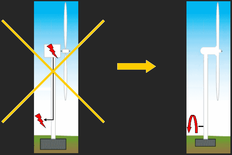 Les éoliennes classiques produisent de l’électricité grâce à un alternateur logé dans la nacelle, en haut du mât. Cet alternateur est en prise directe sur l’hélice de l’éolienne, parfois par l’intermédiaire d’un multiplicateur, et produit de l’électricité qui est acheminée au pied de l’éolienne par des câbles.