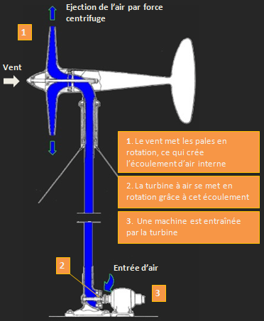 L’énergie de cet écoulement est recueillie par une petite turbine à air logée dans le mât, au pied de l’éolienne. Cette turbine est une roue simple munies d’aubages. L’axe de la turbine sort du mât, de manière à ce qu’on y connecte toute machine tournante :
