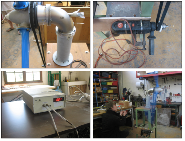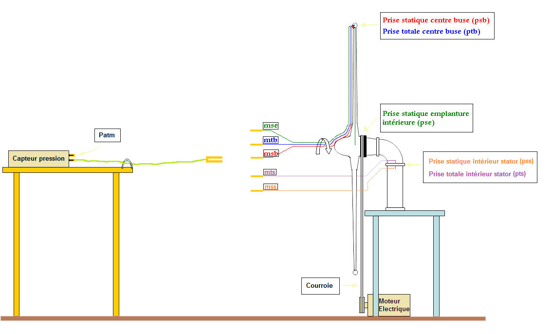 L'éolienne est fixée sur une plaque de bois. Un trou dans cette dernière peut permettre à l'air d'entrer, et un bouchon étanche est prévu pour les essais vanne fermée. L'éolienne est entraînée en rotation grâce à une perceuse, par l'intermédiaire d'une courroie (vitesse max 400 rpm). La perceuse contient des crans de vitesse qui assurent la répétabilité des expériences. Des prises de pression sont piqués partout sur l'éolienne, sur les parties fixes mais aussi sur les parties tournantes. Un capteur de pression différentiel permet de comparer une des prises de pression avec la pression atmosphérique. Le tachymètre laser est bien entendu utilisé pour contrôler la vitesse de rotation de l'hélice.