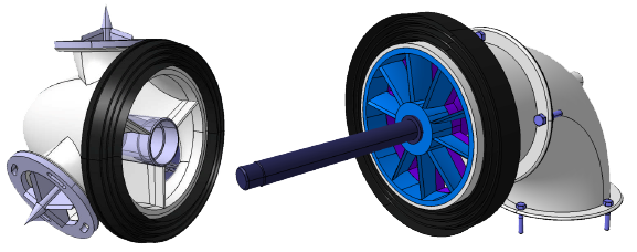 L'éjection de l'air en bout de pale est tangentielle vers l'arrière. Bien entendu l'air sort vers l'arrière avec une vitesse relative plus faible que la vitesse absolue de la pale, de sorte que l'éjection de l'air constitue bien un couple résistant pour l'hélice, ce qui est naturel si on souhaite lui prendre de l'énergie. La buse de sortie d'air a été longuement étudiée par Jean Andreau., qui en a testé plusieurs. La marge d'optimisation de cette sortie d'air est encore inconnue sur le rendement global, mais elle sera étudiée prochainement à Supaero.