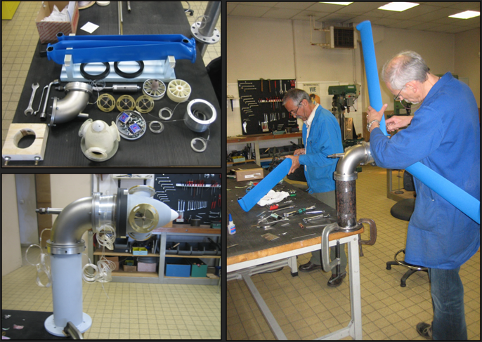Les pales viennent se visser sur les tourillons. Un capotage, réalisé en fil fondu, assure le guidage de l'air vers les 3 pales, et la forme d'ogive. Enfin un labyrinthe sans frottement assure l'étanchéité à l'air entre rotor et stator. Patrick Morel (au premier plan sur la photo) a réalisé les différentes pièces et le montage mécanique. La fixation des pales a été réalisée avec Guy Mirabel (au second plan).