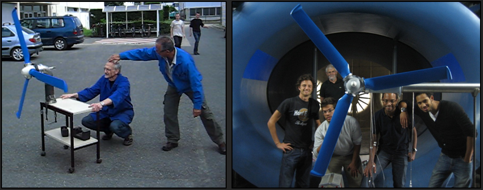 L'hélice de notre prototype d'éolienne à dépression a été construite à Supaero, par l'intermédiaire d'un projet d'initiation recherche de 2e année. De septembre 2009 à juin 2010, 4 élèves extrêmement motivés se sont attelés à la tache de concevoir ce rotor d'éolienne à dépression. Deux techniciens principaux ont assuré la réalisation (composite et mécanique), et deux personnes encadraient les élèves. Nicolas Andreau portait le projet à plein temps.