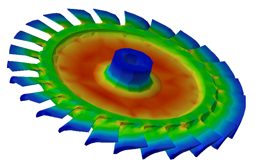 La pièce critique est la roue mobile, puisqu'elle doit pouvoir supporter des milliers de tours par minutes. Nous nous sommes assurés par simulation Catia que la matériaux employé pour sa fabrication était à-même de supporter ces contraintes centrifuges.
