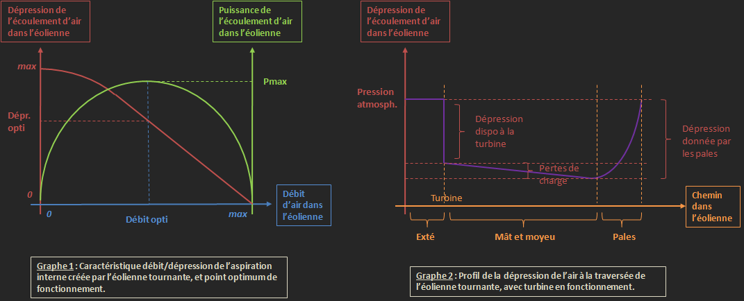 Graphe 1 (à gauche) : L'éolienne qui tourne se comporte comme une pompe centrifuge sans volute, entraînée par le vent. Elle présente une caractéristique débit/dépression classique : si on bouche totalement le mât, la dépression interne est maximale et le débit d'air est nul. La puissance disponible, produit débit x dépression, est donc nulle. A l'inverse, si on ouvre totalement le mât, on a un débit d'air maximum, mais une dépression - presque - nulle, donc encore une puissance nulle. Entre ces deux états existe une cloche de puissance, qui atteint un maximum pour un couple (débit/dépression) donné.