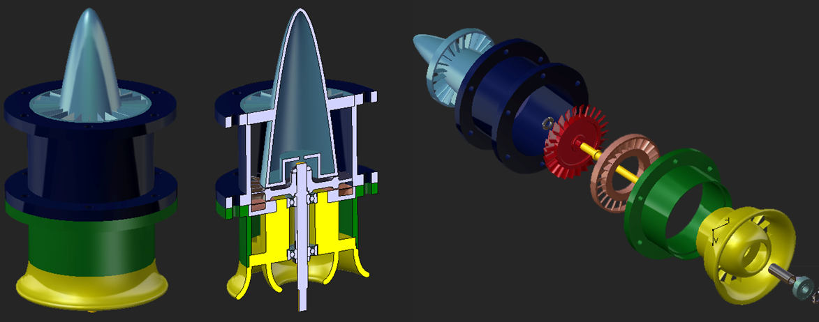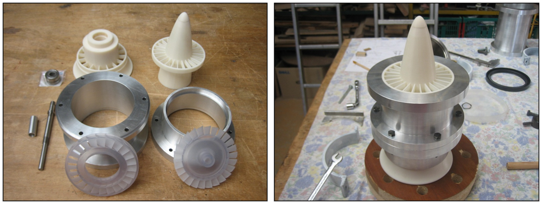 . Le stator et le diffuseur (pièces jeune et bleu clair) ont été faits en fil fondu (impression 3D à partir du fichier CAO), dans le laboratoire de mécanique de l'INSA, par Michel Seitier.