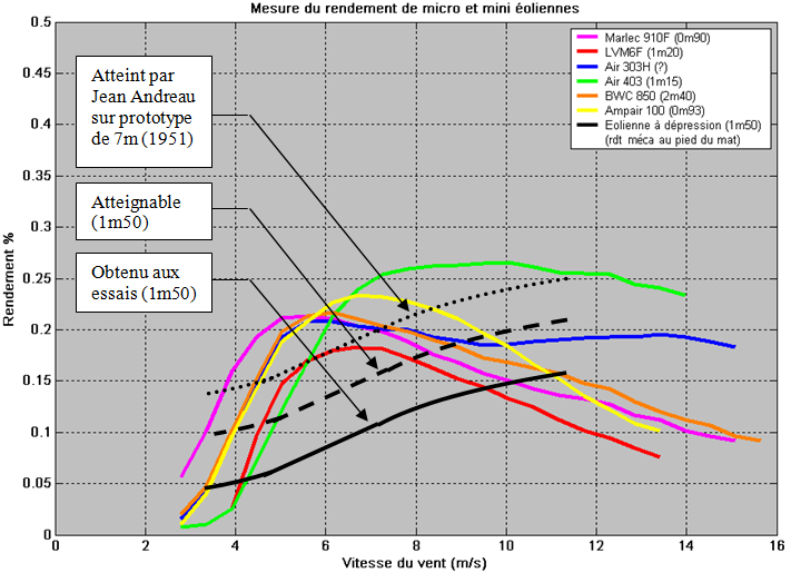 Comme il est difficile d’avoir des informations sur les rendements mécaniques des éoliennes multipales de pompage, effectuons la comparaison du Cp obtenu avec les Cp électriques de quelques petites éoliennes :