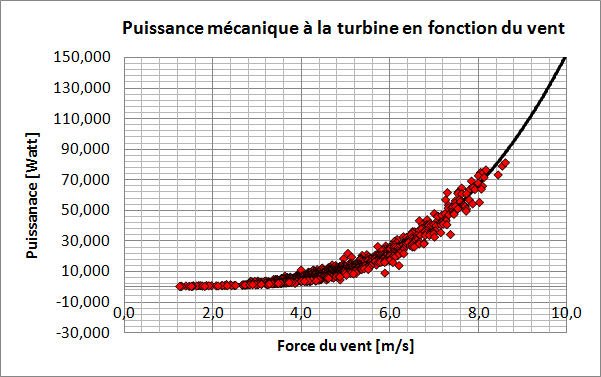 Grâce aux mesures récoltées nous avons pu, malgré une génératrice inadaptée, remonter à la puissance mécanique disponible sur l'arbre turbine (détails dans le rapport de test, à la fin de cet article). Voici ce que nous avons obtenu: