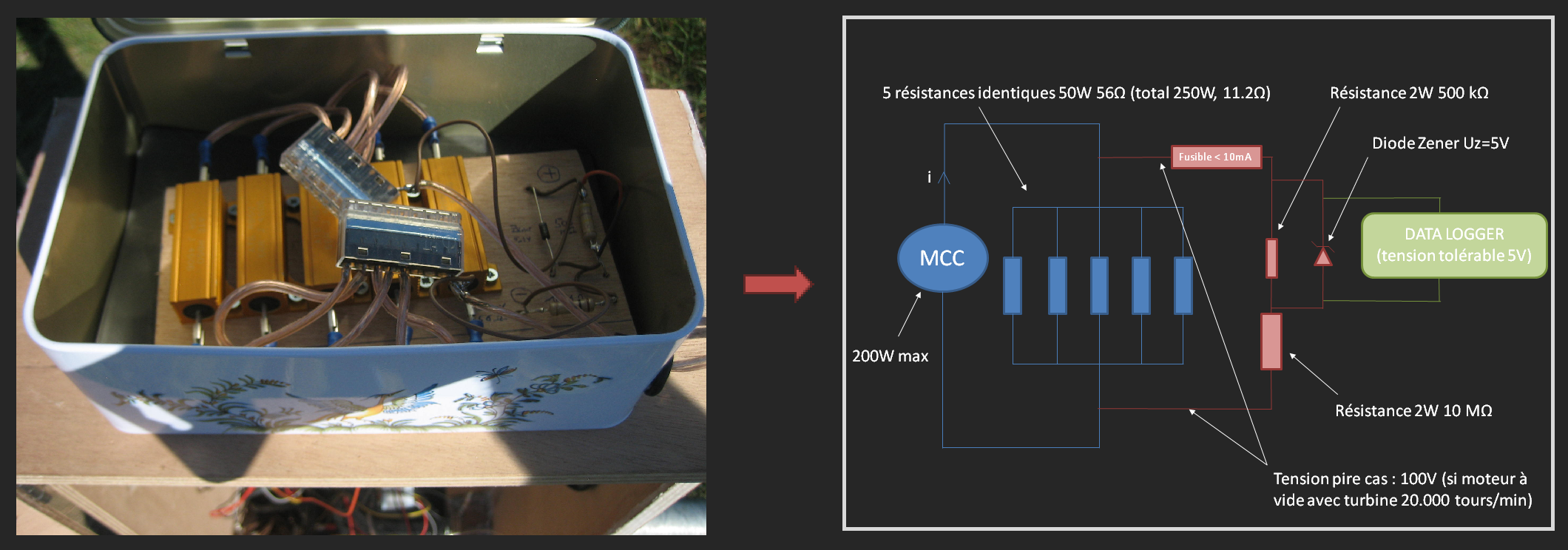Pour charger la génératrice afin de produire du courant et de mesurer la puissance, nous l’avons simplement connectée à des résistances de puissances. En tout, 5 résistances 50W/56Ohms branchées en parallèle, pour une résistance équivalente d’environ 11 Ohms et une puissance admissible de 250W. Un pont diviseur de tension a été ajouté pour pouvoir prendre la tension sans dommage avec le datalogger.