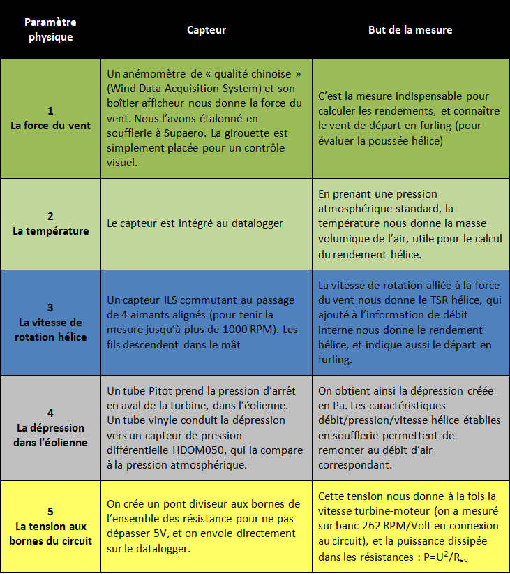 Afin d’avoir un maximum de visibilité sur le fonctionnement de l’éolienne, il a été décidé de concevoir une petite chaîne de mesure, avec séquencement et stockage des données. Voici l’ensemble des mesures et leur fonction :