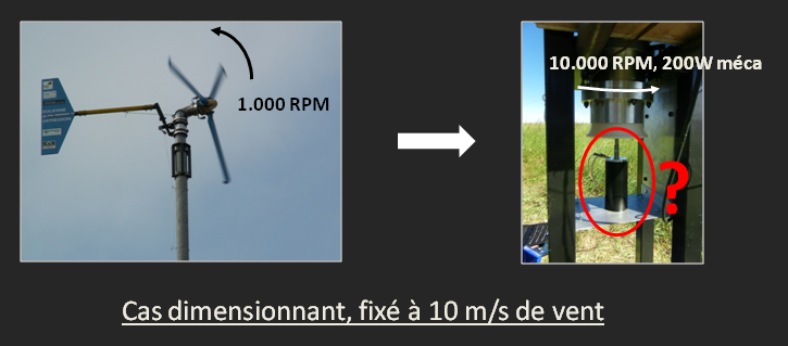 En prévoyant un vent maxi de 10m/s, un rendement maxi de 0.2, la turbine ne lui donnera pas plus de 200W de puissance mécanique. Il nous faudrait donc idéalement un moteur électrique réversible de 200W pour 10.000 tours/min. Pas facile à trouver…