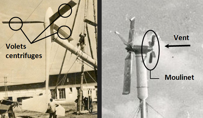 Jean Andreau a beaucoup étudié la question sur ses prototypes. Le premier prototype de 6m50 de diamètre disposait d'une dérive d'orientation, et d'un système de volets centrifuge sur l'extrados des pales. Le second prototype de 7m était sous le vent du mât (sans dérive), et disposait d'une variation de pas des pales, mécanique et passive. Ce système était actionné par un moulinet frontal qui exerçait un couple statique en fonction de la force du vent. Il assurait la régulation de l'hélice au delà du vent nominal, mais aussi l'arrêt de celle-ci en cas d'ouragan.