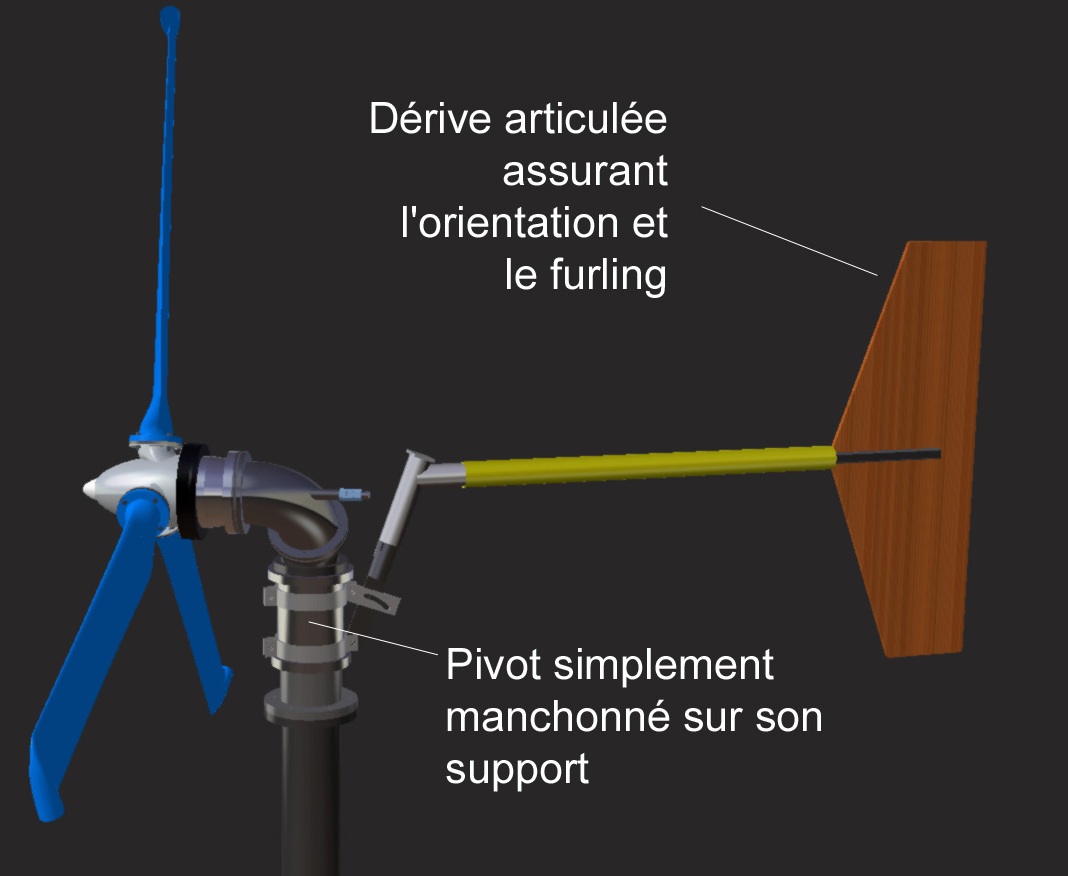 Toute éolienne doit assurer une orientation de son hélice face au vent de manière autonome. Les grosse éoliennes le font de manière active, avec des capteurs de vent et des actionneurs électriques. Les plus petites éoliennes assurent cette fonction de manière passive, c'est à dire sans apport d'énergie autre que le vent. Il existe deux possibilités pour cela : mettre l'éolienne sous le vent du mât, ou bien mettre l'éolienne face au vent à l'aide d'une dérive. C'est cette seconde solution que nous avons choisie, pour des raisons expliquées dans le paragraphe suivant. La rotation de l'éolienne autour du mât est réalisée par simple manchonnage d'un tube métallique sur un autre, avec de la graisse pour lubrifier le contact.