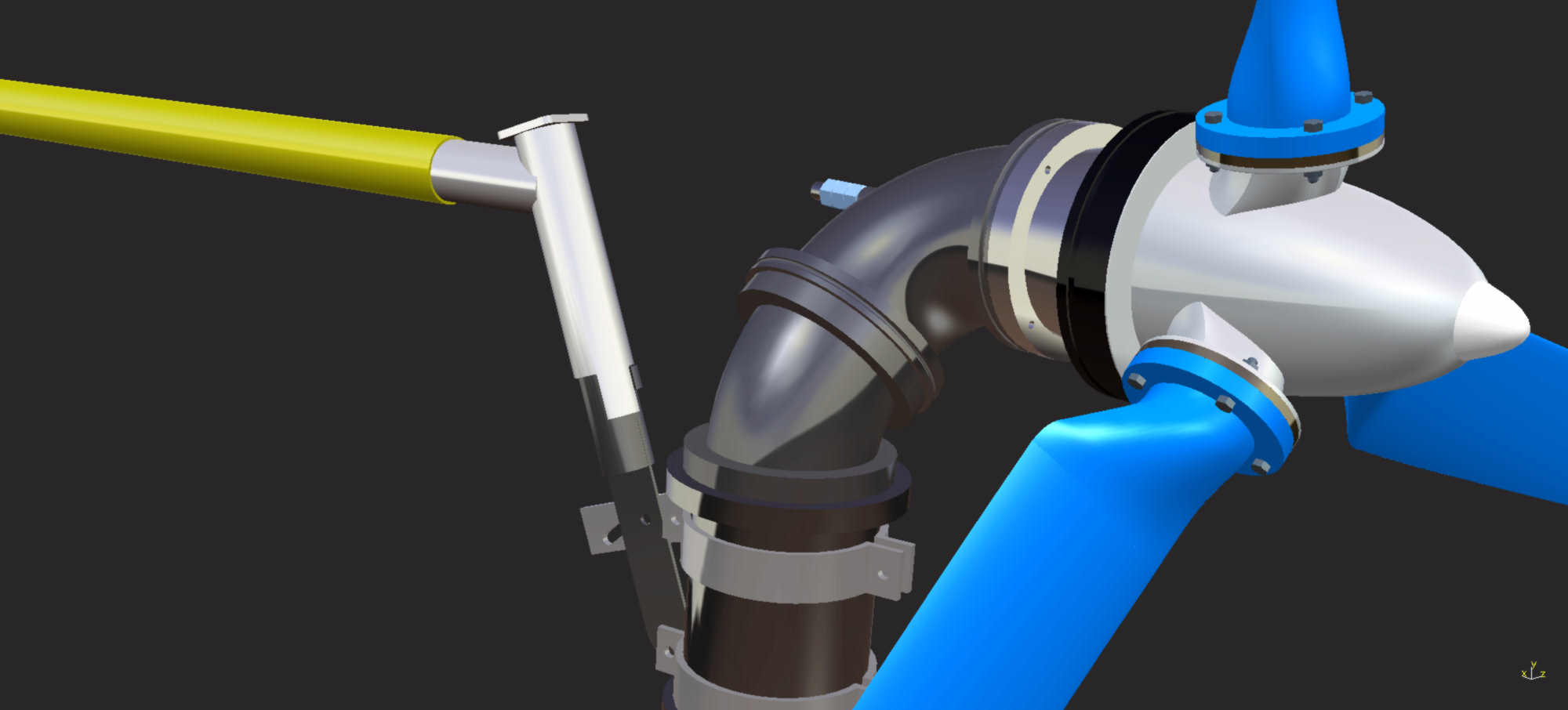 Ce déport est assuré par un coude de 45 degrés qui précède le coude à 90 degrés menant au rotor. Il permet un décalage entre l'axe de l'hélice et l'axe du mât d'une dizaine de centimètres. Comme sur l'éolienne Piggott, la dérive est articulée au niveau de son point d'attache, avec un angle d'élévation qui assure un couple de rappel par gravité. Le système est ainsi simplifié au maximum.
